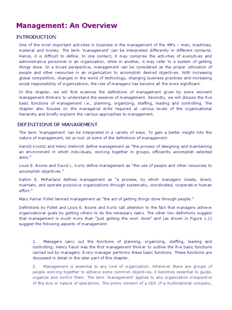 One of the most important activities in business is the management of the 4Ms men, machines, material and money. The term management can be interpreted differently in different contexts. Hence, it is difficult to define. In one context, it may comprise the activities of executives and administrative personnel in an organization, while in another, it may refer to a system of getting things done. In a broad perspective, management can be considered as the proper utilization of people and other resources in an organization to accomplish desired objectives. With increasing global competition, changes in the world of technology, changing business practices and increasing social responsibility of organizations, the role of managers has become all the more significant. In this chapter, we will first examine the definitions of management given by some eminent management thinkers to understand the essence of management. Secondly, we will discuss the five basic functions of management i.e., planning, organizing, staffing, leading and controlling. The chapter also focuses on the managerial skills required at various levels of the organizational hierarchy and briefly explains the various approaches to management.