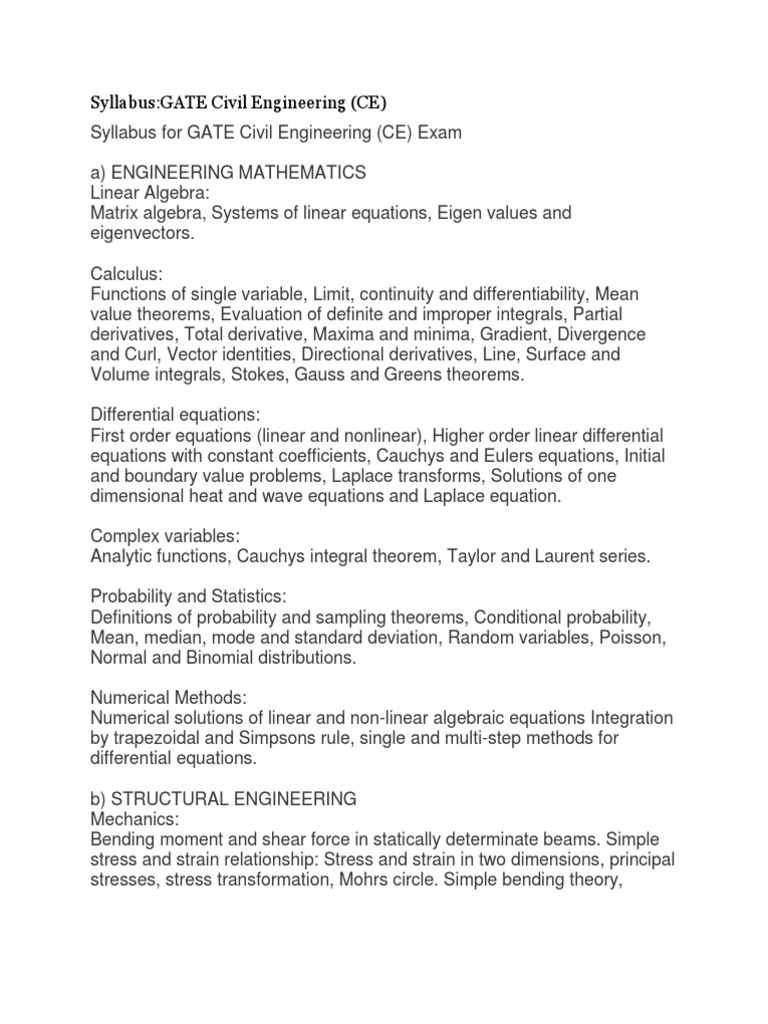Matrix algebra, Systems of linear equations, Eigen values and eigenvectors. Calculus: Functions of single variable, Limit, continuity and differentiability, Mean value theorems, Evaluation of definite and improper integrals, Partial derivatives, Total derivative, Maxima and minima, Gradient, Divergence and Curl, Vector identities, Directional derivatives, Line, Surface and Volume integrals, Stokes, Gauss and Greens theorems. Differential equations: First order equations (linear and nonlinear), Higher order linear differential equations with constant coefficients, Cauchys and Eulers equations, Initial and boundary value problems, Laplace transforms, Solutions of one dimensional heat and wave equations and Laplace equation. Complex variables: Analytic functions, Cauchys integral theorem, Taylor and Laurent series. Probability and Statistics: Definitions of probability and sampling theorems, Conditional probability, Mean, median, mode and standard deviation, Random variables, Poisson, Normal and Binomial distributions. Numerical Methods: Numerical solutions of linear and non-linear algebraic equations Integration by trapezoidal and Simpsons rule, single and multi-step methods for differential equations. b) STRUCTURAL ENGINEERING Mechanics: Bending moment and shear force in statically determinate beams. Simple stress and strain relationship: Stress and strain in two dimensions, principal stresses, stress transformation, Mohrs circle. Simple bending theory,