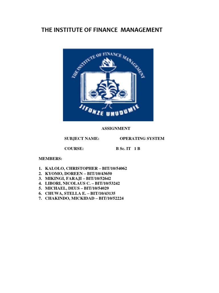 ASSIGNMENT SUBJECT NAME: COURSE: MEMBERS: 1. 2. 3. 4. 5. 6. 7. KALOLO, CHRISTOPHER BIT/10/54062 KYOMO, DOREEN BIT/10/43650 MIKINGI, FARAJI BIT/10/52642 LIBORI, NICOLAUS C. BIT/10/53242 MICHAEL, DEUS BIT/10/54029 CHUWA, STELLA E. BIT/10/43135 CHAKINDO, MICKIDAD BIT/10/52224 OPERATING SYSTEM B Sc. IT 1 B