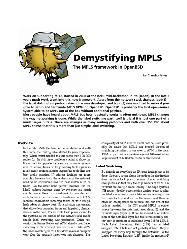 Work on supporting MPLS started in 2008 at the n2k8 mini-hackathon in Ito (Japan). In the last 2 years much work went into this new framework. Apart from the network stack changes ldpd(8) -the label distribution protocol daemon -- was developed and bgpd(8) was modied to make it possible to setup and terminate MPLS VPNs on OpenBSD. OpenBSD is probably the rst open-source system able to do MPLS out of the box without additional patches. Most people have heard about MPLS but how it actually works is often unknown. MPLS changes the way networking is done. While the label switching part itself is trivial it is just one part of a much larger puzzle. There are changes in many routing protocols and with over 150 RFC about MPLS shows that this is more than just simple label switching.