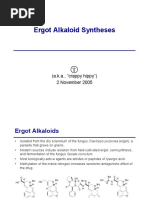 INDOLE ALKALOIDS ERGOT / ARGOT / ST. ANTHONYS FIRE BIOLOGICAL SOURCE: schlerotium of fungus claviceps purpurea, at the ovary of rye plant secale cereale Family: graminae (fungus belongs to family clavicipitaceae) GEOGRAPHICAL SOURCE: Switzerland Known to have caused gangrene (ergotism) in germany Life cycle: sexual / sphacelial stage asexual / schlerotium stage Sexual stage: The ascospores infect the ovary of the rye plant & if conditions are favourable it develops hyphal strands It forms a white mass over the ovary known as the mycelium Asexual stage: The hyphal strands further develop invading the ovary & converting it to a hard violet schlerotium Schlerotium contains stromatum which shows a globular stalk It encloses bag like structures known as ascus containing ascospores If these ascospores are liberated they infect another rye plant Morphology of schlerotium: Hard, violet, odourless, with an unpleasant taste Chemistry: Derivatives of lysergic acid Water soluble ones are ergometrine & ergometrinine Water insoluble ones are ergotamine & ergotoxine Only the levo isomer is active Uses: Ergometrine is an oxytocic drug but its methyl derivative is preferred as it causes less hypertension Ergotamine is analgesic in migraine Chemical Test: gives a blue colour with Van Curks reagent (para dimethyl amino benzaldehyde) gives blue fluorescence in water when treated with ether, H2SO4 followed by sodium bicarbonate, aqueous layer shows a red violet colour ergotamine + glacial acetic acid + ethyl acetate + H2SO4 gives a blue solution with a red tinge. When further treated with FeCl3 the blue colour disappears