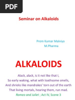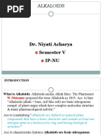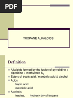 Alkaloids are basic nitrogen containing compounds obtained from plants, animals & microorganisms having a marked physiological action Characteristics: Well defined crystalline substances, generally occurring as solids except nicotine which is a liquid, colourless except berberine which is a yellow coloured alkaloid. Occur in plants in the salt form. They answer the following chemical tests: mayers reagent- (potassium mercuric iodide) cream coloured precipitate wagners reagent- (iodine in potassium iodide) reddish brown precipitate hagers reagent- (salt solution of picric acid) yellow precipitate dragendorfs reagent- (potassium bismuth iodide) reddish brown precipitate Caffeine is a pseudo alkaloid drug which does not answer this test Extraction: The powdered drug is defatted using petroleum ether if necessary The powder is further basified using lime to break the salt form of the alkaloid & liberate free base which can be extracted using an organic solvent Alkaloidal salts can be directly extracted using an acidified aqueous solvent Classification: pharmacological method taxonomic method biosynthetic method chemical method true & proto alkaloids TRUE ALKALOIDS 1. Pyrrole & pyrrolidine eg- coca 2. pyridine & piperidine eg- coniine 3. tropane eg- atropine 4. quinoline eg- cinchona 5. indole eg- rauwolfia 6. purine eg- caffeine 7. steroidal eg- kurchi 8. isoquinoline eg- opium