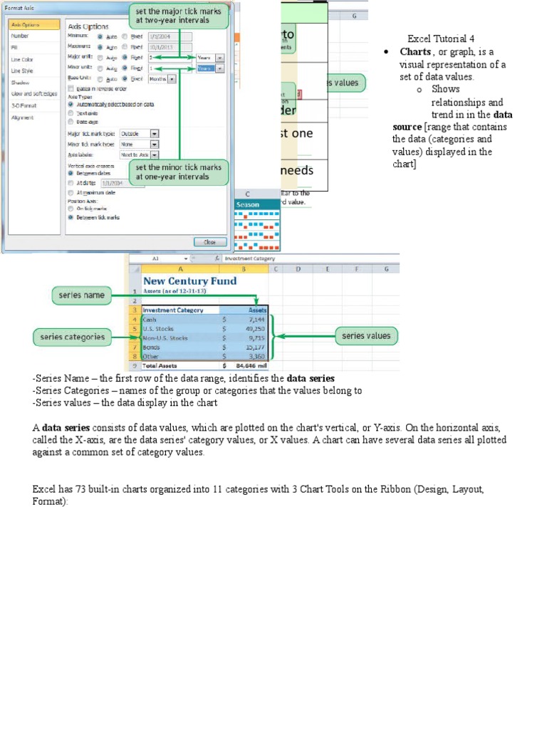 -Series Name the first row of the data range, identifies the data series -Series Categories names of the group or categories that the values belong to -Series values the data display in the chart A data series consists of data values, which are plotted on the chart's vertical, or Y-axis. On the horizontal axis, called the X-axis, are the data series' category values, or X values. A chart can have several data series all plotted against a common set of category values. Excel has 73 built-in charts organized into 11 categories with 3 Chart Tools on the Ribbon (Design, Layout, Format):