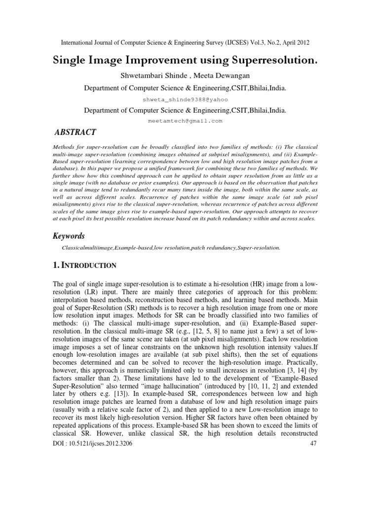 International Journal of Computer Science & Engineering Survey (IJCSES) Vol.3, No.2, April 2012 [11] W. T. Freeman, T. R. Jones, and E. C. Pasztor. Examplebased super-resolution. Comp. Graph. Appl., (2), 2002. [12] M. Irani and S. Peleg. Improving resolution by image registration. CVGIP, (3), 1991. [13] K. Kim and Y. Kwon. Example-based learning for singleimage SR and JPEG artifact removal. MPITR, (173), 08. [14] Z. Lin and H. Shum. Fundamental Limits of Reconstruction- Based Superresolution Algorithms under Local Translation. PAMI, (1), 04. [15] G. Peyre, S. Bougleux, and L. D. Cohen. Non-local regularization of inverse problems. In ECCV, 2008. Authors