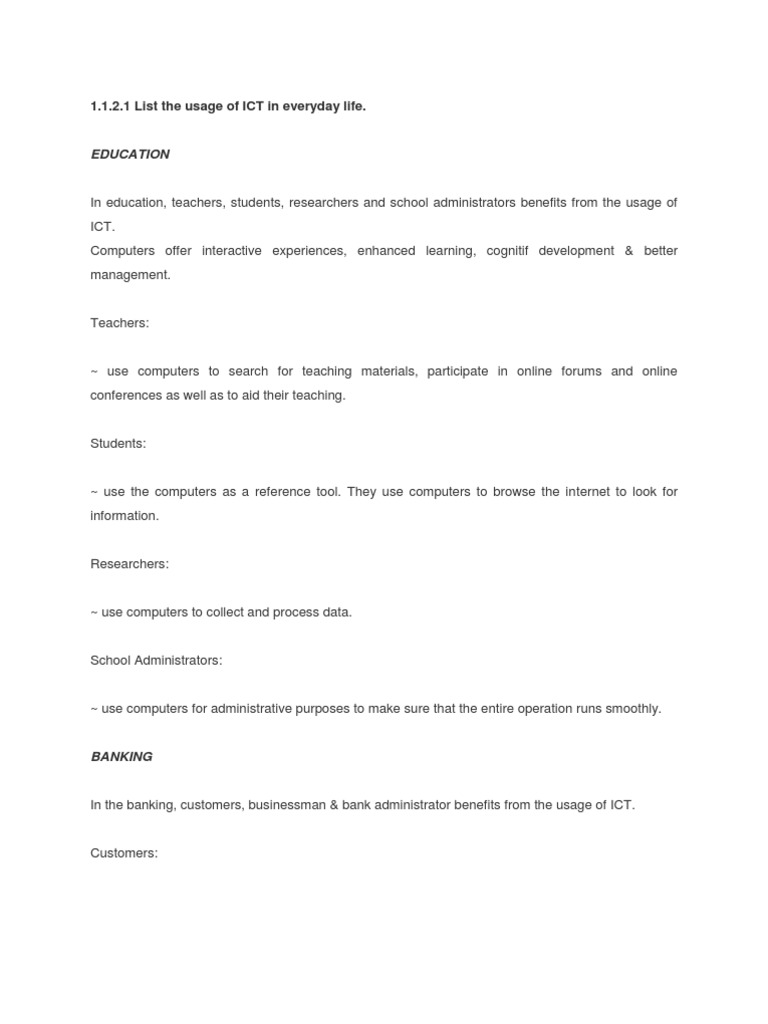In the banking, customers, businessman & bank administrator benefits from the usage of ICT.