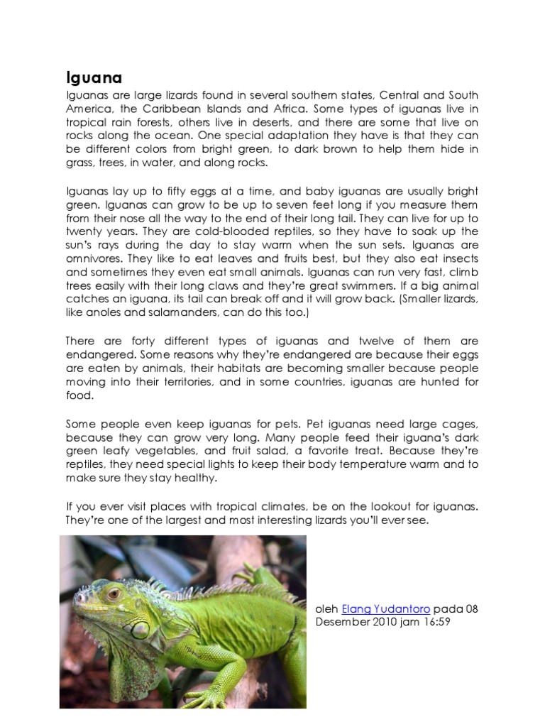 Iguanas are large lizards found in several southern states, Central and South America, the Caribbean Islands and Africa. Some types of iguanas live in tropical rain forests, others live in deserts, and there are some that live on rocks along the ocean. One special adaptation they have is that they can be different colors from bright green, to dark brown to help them hide in grass, trees, in water, and along rocks. Iguanas lay up to fifty eggs at a time, and baby iguanas are usually bright green. Iguanas can grow to be up to seven feet long if you measure them from their nose all the way to the end of their long tail. They can live for up to twenty years. They are cold-blooded reptiles, so they have to soak up the suns rays during the day to stay warm when the sun sets. Iguanas are omnivores. They like to eat leaves and fruits best, but they also eat insects and sometimes they even eat small animals. Iguanas can run very fast, climb trees easily with their long claws and theyre great swimmers. If a big animal catches an iguana, its tail can break off and it will grow back. (Smaller lizards, like anoles and salamanders, can do this too.) There are forty different types of iguanas and twelve of them are endangered. Some reasons why theyre endangered are because their eggs are eaten by animals, their habitats are becoming smaller because people moving into their territories, and in some countries, iguanas are hunted for food. Some people even keep iguanas for pets. Pet iguanas need large cages, because they can grow very long. Many people feed their iguanas dark green leafy vegetables, and fruit salad, a favorite treat. Because theyre reptiles, they need special lights to keep their body temperature warm and to make sure they stay healthy. If you ever visit places with tropical climates, be on the lookout for iguanas. Theyre one of the largest and most interesting lizards youll ever see.