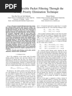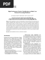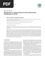 Several algorithms for packets classication on multiple elds for software implementation on generic CPUs have been proposed in recent time [Begel et al., 4; Feldmann and Muthukrishnan, 9; Srinivasan, 18; Baboescu and Varghese, 3]. Begel et al. [4] proposes a fully general packet lter framework. Filters are specied in a declarative predicate language, compiled into a ow-graph, and then optimized before being executed on a virtual machine model. Optimization is performed on the ow-graph by using redundant predicate elimination for removing redundancies and rearranging non-optimal code sequences. The evaluation of the tool shows good performance. However, only small test cases are applied. In [3], Baboescu and Varghese describe a scheme called Aggregate Bit Vector (ABV). The aim of the scheme is to provide scalable packet classication (100,000 rules) to handle large lters while also providing efcient classication times on generic CPUs. The scheme is an extension of the bit vector search algorithm (BV) described in [Lakshman and Stiliadis, 14]. In [11], Hazelhurst presents the idea of transforming rewall packet lters into Boolean expressions that are represented as BDDs. The paper describes an algorithm for transforming a rewall lter specied in a Cisco-like access list language into a BDD, including the handling of issues with overlapping rules. The main focus of BDDs in this paper is a tool that can analyze and test lters. A later paper by Hazelhurst et al. [12] focus on using the BDD structures for performing packet classication. The conclusion is that BDDs can improve the lookup latency on systems using dedicated hardware such as FPGAs, while they do not perform well on generic CPUs. In [2], Attar and Hazelhurst use N-ary decision diagrams for improving the lookup performance. The experimental results show that the lookup time can be signicantly improved by using this method, however at the price of increased memory usage. More recently, in [15], Rovniagin and Wool describe an algorithm called Geometric Efcient Matching (GEM). Classifying packets with GEM has a time complexity of O(m log n), where m is the number of elds and n is the number of rules. Unfortunately, the worst case space complexity is O(n4 ). Indeed, the authors manage to show nice empirical results with this technique. In [Singh et al., 17], decision trees are widely used to classify packets. The authors introduce a new technique to split the domain of possible values into nearly optimum division. 3. Packet ltering