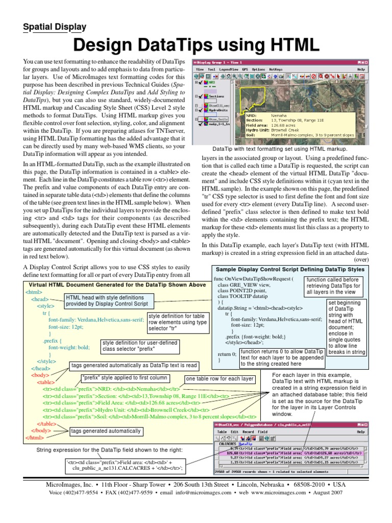 <html> HTML head with style definitions <head> provided by Display Control Script <style> tr { style definition for table font-family: Verdana,Helvetica,sans-serif; row elements using type font-size: 12pt; selector "tr" } .prefix { style definition for user-defined to allow line font-weight: bold; class selector "prefix" return 0; function returns 0 to allow DataTip breaks in string } text for each layer to be appended } </style> to the string created here tags generated automatically as DataTip text is read </head> For each layer in this example, <body> "prefix" style applied to first column one table row for each layer DataTip text with HTML markup is <table> created in a string expression field in <tr><td class="prefix">NRD: </td><td>Nemaha</td></tr> an attached database table; this field <tr><td class="prefix">Section: </td><td>13,Township 08, Range 11E</td><tr> is set as the source for the DataTip <tr><td class="prefix">Field Area: </td><td>126.68 acres</td><tr> for the layer in its Layer Controls <tr><td class="prefix">Hydro Unit: </td><td>Brownell Creek</td><tr> window. <tr><td class="prefix">Soil: </td><td>Morrill-Malmo complex, 3 to 8 percent slopes</td><tr> </table> </body> tags generated automatically </html>
