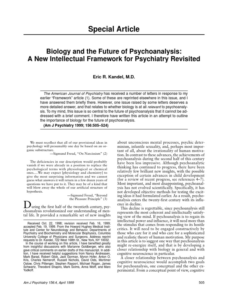 Received Oct. 22, 1998; revision received Feb. 16, 1999; accepted Feb. 19, 1999. From the Howard Hughes Medical Institute and Center for Neurobiology and Behavior, Departments of Psychiatry and Biochemistry and Molecular Biophysics, Columbia University College of Physicians and Surgeons. Address reprint requests to Dr. Kandel, 722 West 168th St., New York, NY 10032. In the course of working on this article, I have benefited greatly from insightful discussions with Marianne Goldberger, who also gave critical comments on earlier drafts of this manuscript. In addition, I have received helpful suggestions from Nancy Andreasen, Mark Barad, Robert Glick, Jack Gorman, Myron Hofer, Anton O. Kris, Charles Nemeroff, Russell Nicholls, David Olds, Mortimer Ostow, Chris Pittenger, Stephen Rayport, Michael Rogan, James Schwartz, Theodore Shapiro, Mark Solms, Anna Wolff, and Marc Yudkoff.