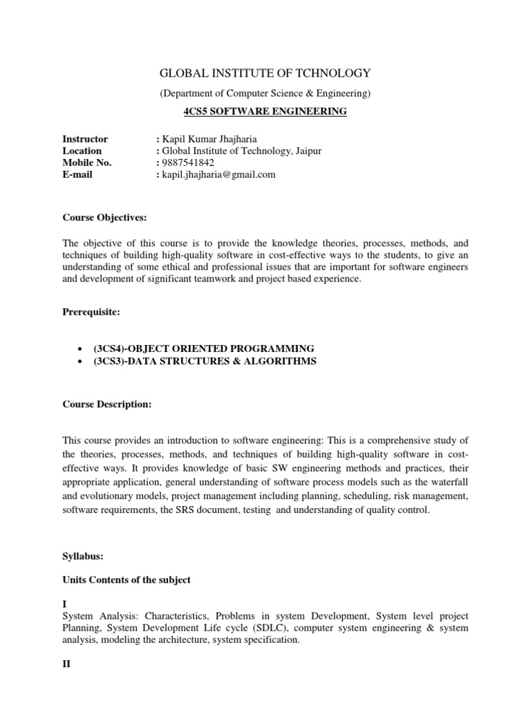 (Department of Computer Science & Engineering) 4CS5 SOFTWARE ENGINEERING Instructor Location Mobile No. E-mail : Kapil Kumar Jhajharia : Global Institute of Technology, Jaipur : 9887541842 : kapil.jhajharia@gmail.com