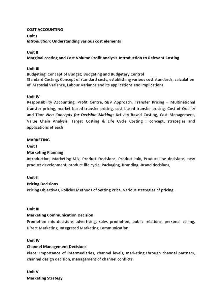 analysis-Introduction to Relevant Costing Unit III Budgeting: Concept of Budget; Budgeting and Budgetary Control Standard Costing: Concept of standard costs, establishing various cost standards, calculation of Material Variance, Labour Variance and its applications and implications. Unit IV Responsibility Accounting, Profit Centre, SBV Approach, Transfer Pricing Multinational transfer pricing, market based transfer pricing, cost-based transfer pricing, Cost of Quality and Time Neo Concepts for Decision Making: Activity Based Costing, Cost Management, Value Chain Analysis, Target Costing & Life Cycle Costing : concept, strategies and applications of each MARKETING Unit I Marketing Planning Introduction, Marketing Mix, Product Decisions, Product mix, Product-line decisions, new product development, product life cycle, Packaging, Branding -Brand decisions, Unit-II Pricing Decisions Pricing Objectives, Policies Methods of Setting Price, Various strategies of pricing.