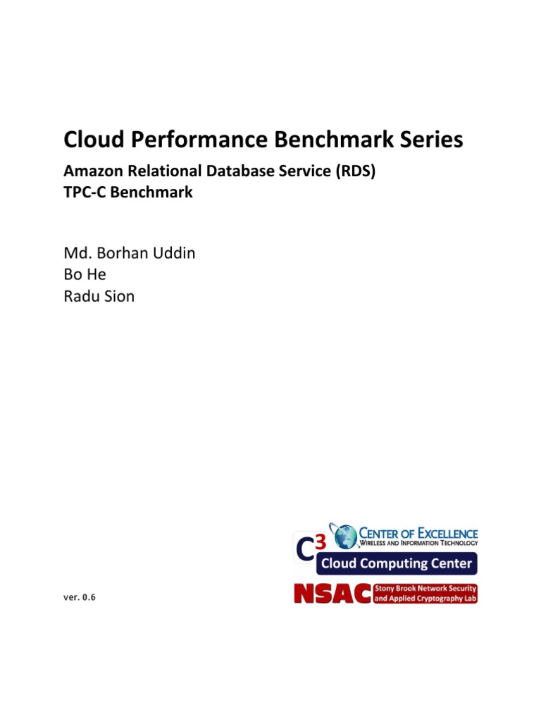 The Amazon Relational Database Service (RDS) runs full-featured MySQL database servers (version 5.1.45). The deployed benchmark was the open-source tpcc-mysql TPCC MySQL benchmark instance, developed by the popular MySQL development community Percona. All of the tested RDS service instances were located on the same Amazon Web Service (AWS) US East-1a region. Extra Large Amazon Elastic Compute Cloud (EC2) machines were used to probe the RDS instances from the same AWS region. EC2-hosted machines were chosen as TPC-C clients in order to minimize the impact of network/bandwidth and other external interference elements associated with extra-cloud clients. Such elements are not the subject of this benchmark which aims to purely assess the performance of (solely) the RDS service in isolation. Custom scripting was developed and deployed on the Extra Large EC2 machines to automate the benchmark and deploy tpcc-mysql to probe the RDS instances, process the benchmarking outputs, and generate summarized analysis data. The benchmark was initiated by uploading the TPC-C database schema (tables and constraints) to the RDS instances. The database schema is shown in Figure 1. The tables were then populated with data, and the RDS services TPC-C performance was then measured. The deliverables of the benchmark were the TPC-C throughput in transactions per minute (tpmC). Amazon offers two types of RDS services. Standard RDS doesnt deploy database replication. Multi-AZ replicates to multiple availability zones synchronously, although the replicated copies are standby only and read operation cant be performed on them. The price of Multi-AZ RDS is double than that of standard RDS. Instance configurations of Multi-AZ RDS are similar to standard RDS. Notwithstanding the RDS service type, the RDS service can be run on different underlying machine configurations. At the time of testing there were five such configurations: Large, Extra Large (XLarge), Double Extra Large (2XLarge), and Quadruple Extra Large (4XLarge). The configurations vary according to their allocated memory