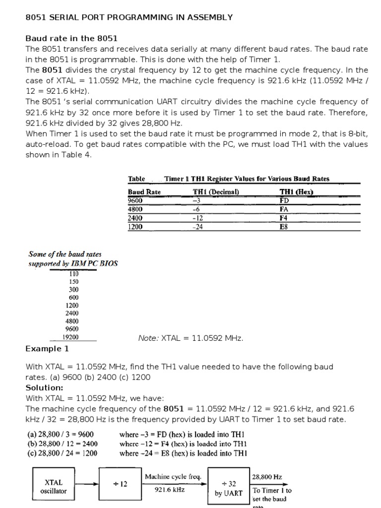 Note: XTAL = 11.0592 MHz. Example 1 With XTAL = 11.0592 MHz, find the TH1 value needed to have the following baud rates. (a) 9600 (b) 2400 (c) 1200 Solution: With XTAL = 11.0592 MHz, we have: The machine cycle frequency of the 8051 = 11.0592 MHz / 12 = 921.6 kHz, and 921.6 kHz / 32 = 28,800 Hz is the frequency provided by UART to Timer 1 to set baud rate.