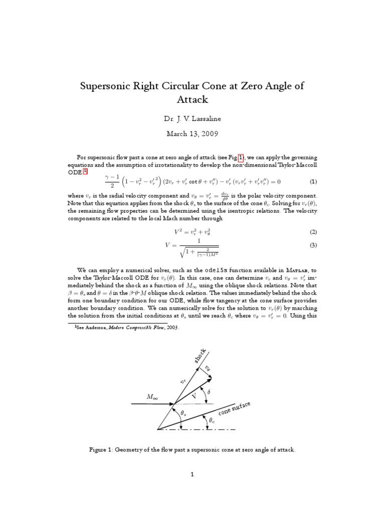 For supersonic ow past a cone at zero angle of attack (see Fig. 1), we can apply the governing equations and the assumption of irrotationality to develop the non-dimensional Taylor-Maccoll ODE 1 ) 1( 2 2 1 vr vr (2vr + vr cot + vr ) vr (vr vr + vr vr ) = 0 (1) 2