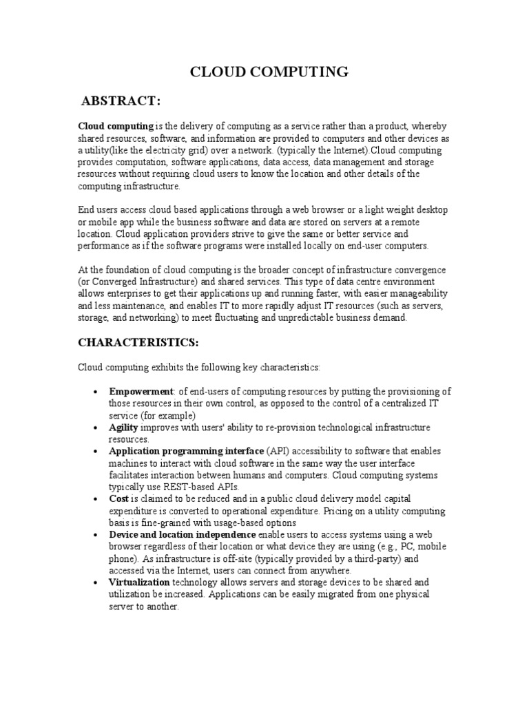 Cloud computing is the delivery of computing as a service rather than a product, whereby shared resources, software, and information are provided to computers and other devices as a utility(like the electricity grid) over a network. (typically the Internet).Cloud computing provides computation, software applications, data access, data management and storage resources without requiring cloud users to know the location and other details of the computing infrastructure. End users access cloud based applications through a web browser or a light weight desktop or mobile app while the business software and data are stored on servers at a remote location. Cloud application providers strive to give the same or better service and performance as if the software programs were installed locally on end-user computers. At the foundation of cloud computing is the broader concept of infrastructure convergence (or Converged Infrastructure) and shared services. This type of data centre environment allows enterprises to get their applications up and running faster, with easier manageability and less maintenance, and enables IT to more rapidly adjust IT resources (such as servers, storage, and networking) to meet fluctuating and unpredictable business demand.