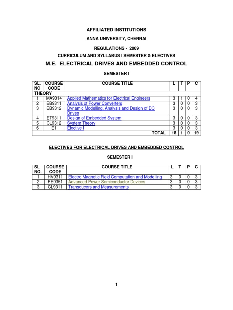 Applied Mathematics for Electrical Engineers Analysis of Power Converters Dynamic Modelling, Analysis and Design of DC Drives Design of Embedded System System Theory Elective I TOTAL