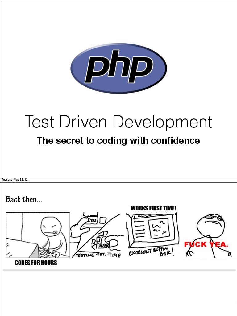 Getting into the habit of writing tests before writing code. TDD are continuous short cycle of test, code, refactor. Test cases are in separate les. No more print_r & var_dump in your code! The tests contain assertions that are either true or false. Passing the tests conrms correct behavior of the code.