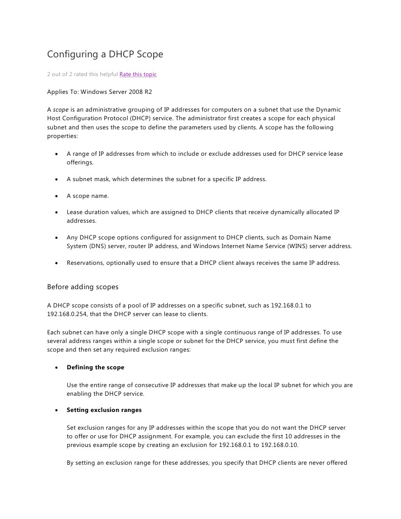Applies To: Windows Server 2008 R2 A scope is an administrative grouping of IP addresses for computers on a subnet that use the Dynamic Host Configuration Protocol (DHCP) service. The administrator first creates a scope for each physical subnet and then uses the scope to define the parameters used by clients. A scope has the following properties: A range of IP addresses from which to include or exclude addresses used for DHCP service lease offerings. A subnet mask, which determines the subnet for a specific IP address. A scope name. Lease duration values, which are assigned to DHCP clients that receive dynamically allocated IP addresses. Any DHCP scope options configured for assignment to DHCP clients, such as Domain Name System (DNS) server, router IP address, and Windows Internet Name Service (WINS) server address. Reservations, optionally used to ensure that a DHCP client always receives the same IP address.