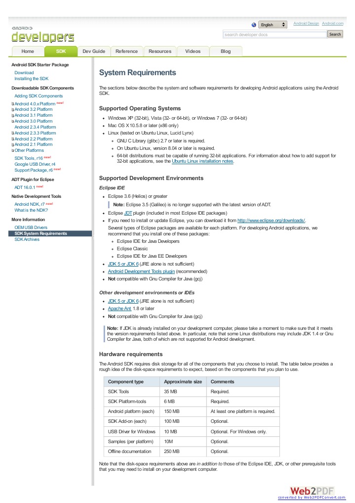 The sections below describe the system and software requirements for developing Android applications using the Android SDK.