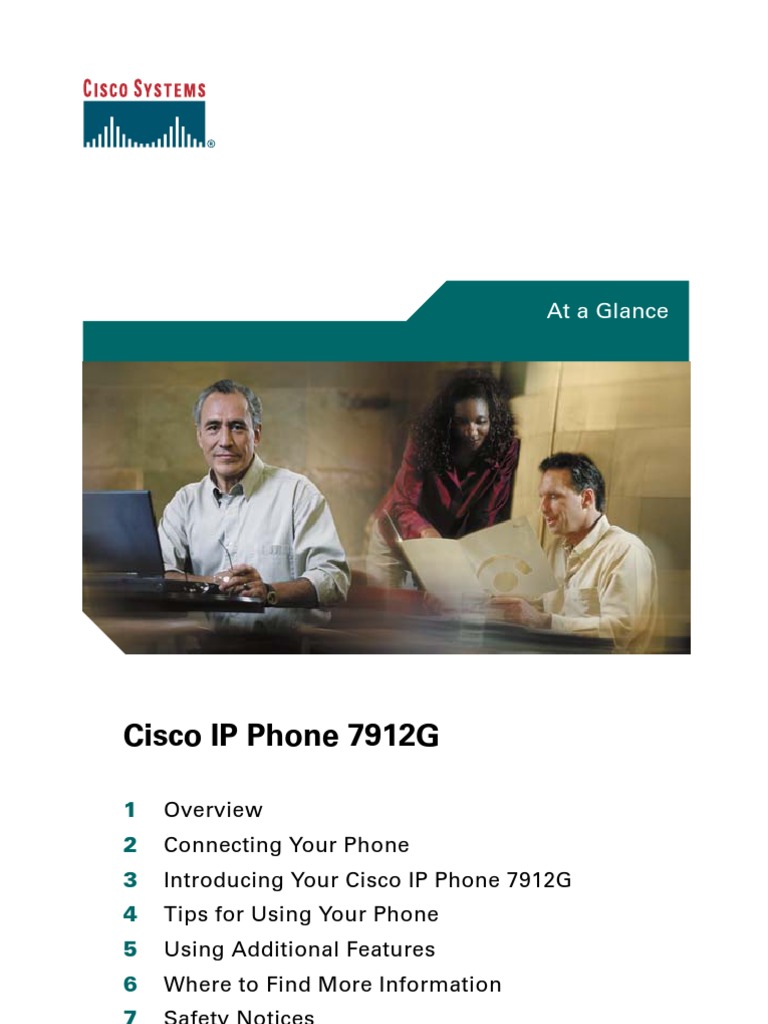 1 2 3 4 5 6 7 Overview Connecting Your Phone Introducing Your Cisco IP Phone 7912G Tips for Using Your Phone Using Additional Features Where to Find More Information Safety Notices