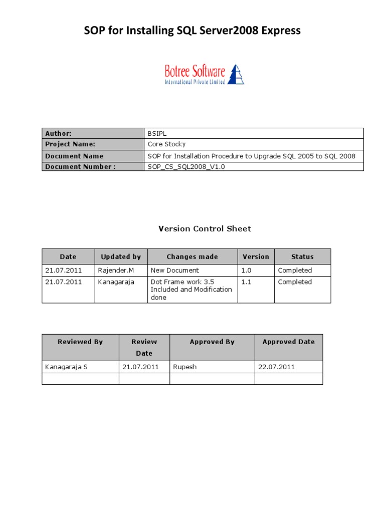 BSIPL Core Stocky SOP for Installation Procedure to Upgrade SQL 2005 to SQL 2008 SOP_CS_SQL2008_V1.0
