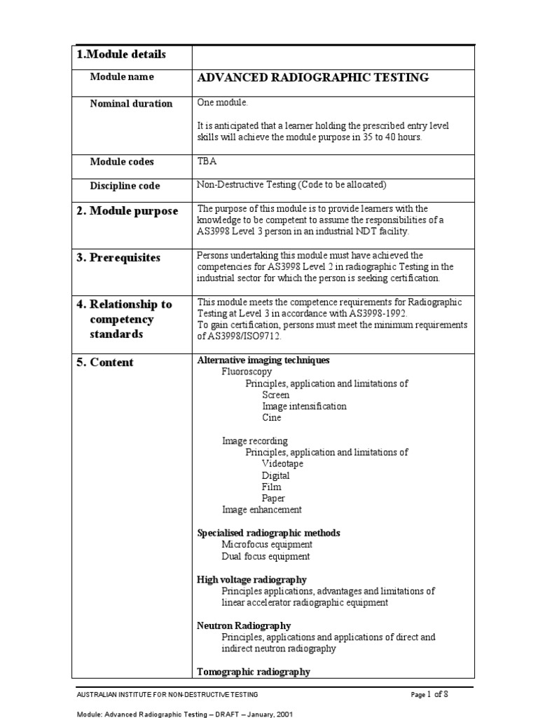 TBA Non-Destructive Testing (Code to be allocated) The purpose of this module is to provide learners with the knowledge to be competent to assume the responsibilities of a AS3998 Level 3 person in an industrial NDT facility. Persons undertaking this module must have achieved the competencies for AS3998 Level 2 in radiographic Testing in the industrial sector for which the person is seeking certification. This module meets the competence requirements for Radiographic Testing at Level 3 in accordance with AS3998-1992. To gain certification, persons must meet the minimum requirements of AS3998/ISO9712. Alternative imaging techniques Fluoroscopy Principles, application and limitations of Screen Image intensification Cine Image recording Principles, application and limitations of Videotape Digital Film Paper Image enhancement Specialised radiographic methods Microfocus equipment Dual focus equipment High voltage radiography Principles applications, advantages and limitations of linear accelerator radiographic equipment Neutron Radiography Principles, applications and applications of direct and indirect neutron radiography Tomographic radiography