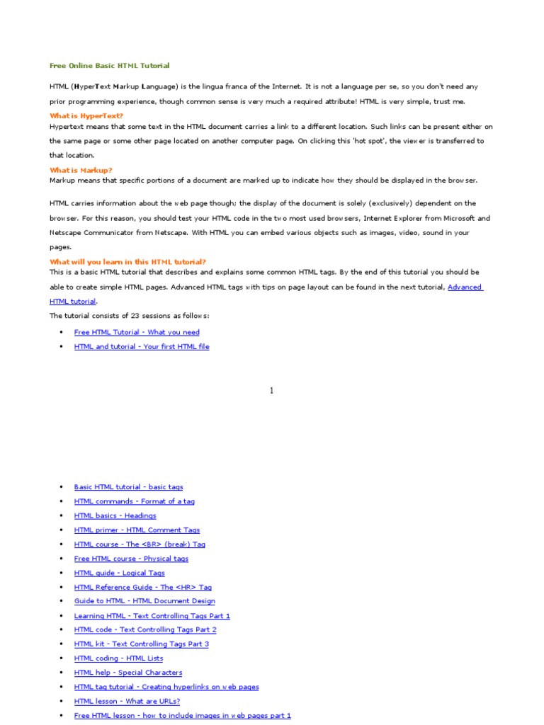 Basic HTML tutorial - basic tags HTML commands - Format of a tag HTML basics - Headings HTML primer - HTML Comment Tags HTML course - The <BR> (break) Tag Free HTML course - Physical tags HTML guide - Logical Tags HTML Reference Guide - The <HR> Tag Guide to HTML - HTML Document Design Learning HTML - Text Controlling Tags Part 1 HTML code - Text Controlling Tags Part 2 HTML kit - Text Controlling Tags Part 3 HTML coding - HTML Lists HTML help - Special Characters HTML tag tutorial - Creating hyperlinks on web pages HTML lesson - What are URLs? Free HTML lesson - how to include images in web pages part 1 Beginner guide to HTML - Including images in web pages part 2 HTML programming tutorial - Creating hyperlinks using images Free HTML - The <BODY> tag attributes Tutorial HTML - Conclusion