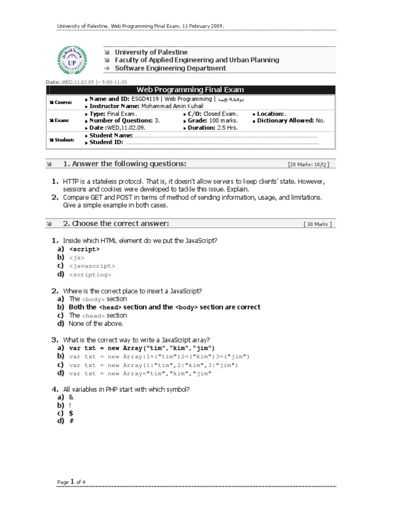 University of Palestine, Web Programming Final Exam, 11 February 2009.