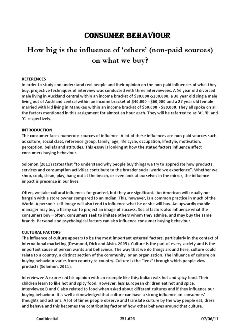 REFERENCES In order to study and understand real people and their opinion on the non-paid influences of what they buy, projective techniques of interview was conducted with three interviewees. A 56 year old divorced male living in Auckland central within an income bracket of $80,000-$100,000, a 30 year old single male living out of Auckland central within an income bracket of $40,000 - $60,000 and a 27 year old female married with kid living in Manukau within an income bracket of $60,000 - $80,000. They all spoke on all the factors mentioned in this assignment for almost an hour each. They will be referred to as A, B and C respectively. INTRODUCTION The consumer faces numerous sources of influence. A lot of these influences are non-paid sources such as culture, social class, reference group, family, age, life cycle, occupation, lifestyle, motivation, perception, beliefs and attitudes. This essay is looking at how the stated factors influence affect consumers buying behaviour. Solomon (2011) states that to understand why people buy things we try to appreciate how products, services and consumption activities contribute to the broader social world we experience. Whether we shop, cook, clean, play, hang out at the beach, or even look at ourselves in the mirror, the influence impact is presence in our lives. Often, we take cultural influences for granted, but they are significant. An American will usually not bargain with a store owner compared to an Indian. This, however, is a common practice in much of the World. A persons self-image will also tend to influence what he or she will buy. An upwardly mobile manager may buy a flashy car to project an image of success. Social factors also influence what the consumers buyoften, consumers seek to imitate others whom they admire, and may buy the same brands. Personal and psychological factors can also influence consumer buying behaviour. CULTURAL FACTORS The influence of culture appears to be the most important external factors, particularly in the context of international marketing (Desmond, Dick and Alvin, 2005). Culture is the part of every society and is the important cause of person wants and behaviour. The way that we do things around here, culture could relate to a country, a distinct section of the community, or an organization. The influence of culture on buying behaviour varies from country to country. Culture is the lens through which people view products (Solomon, 2011). Interviewee A expressed his opinion with an example like this; Indian eats hot and spicy food. Their children learn to like hot and spicy food. However, less European children eat hot and spice. Interviewee B and C also related to food when asked about different cultures and if they influence our buying behaviour. It is well acknowledged that culture can have a strong influence on consumers' thoughts and actions. A lot of times people observe and translate culture by the way people eat, dress and behave and this becomes the contributing factor of how other behaves around that culture.
