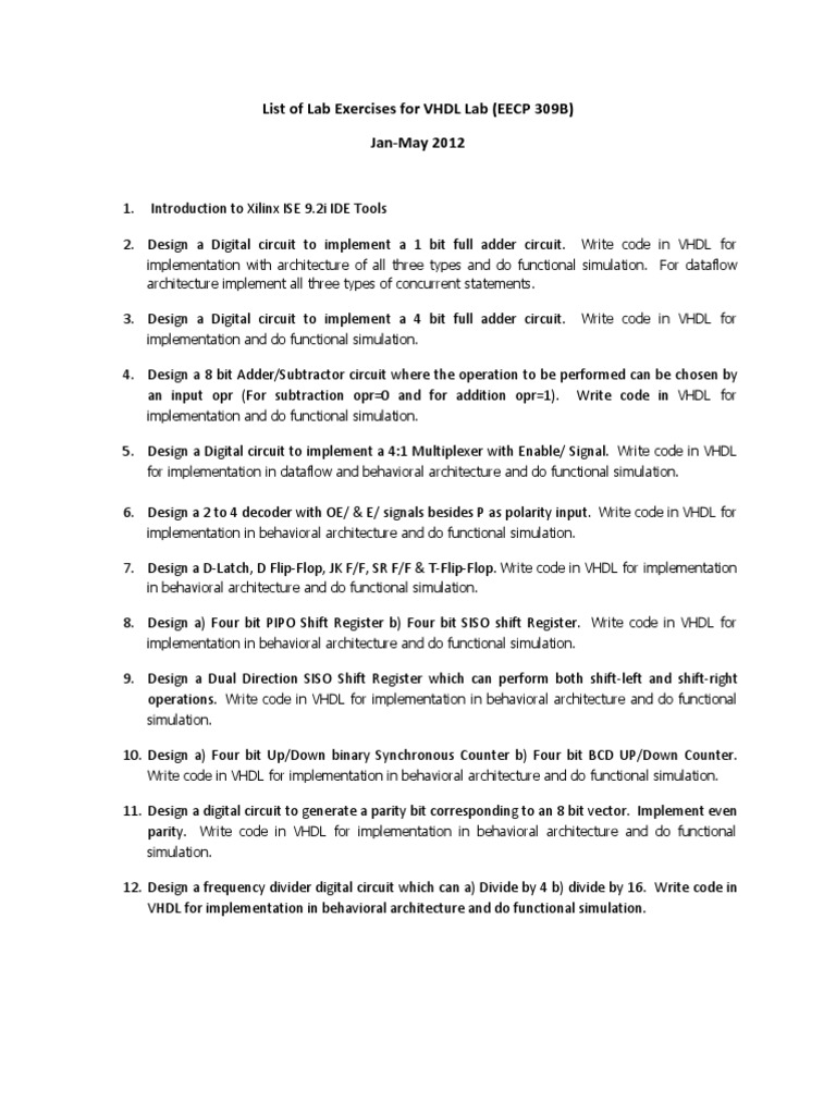 List of Lab Exercises for VHDL Lab (EECP 309B) Jan-May 2012
