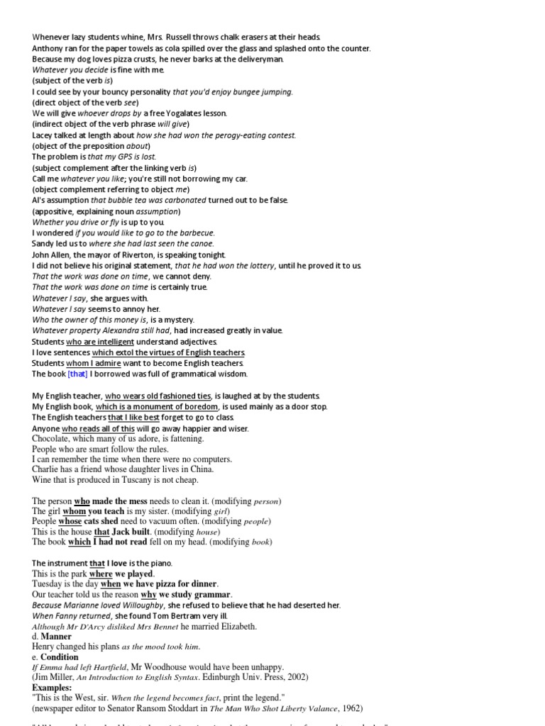Anthony ran for the paper towels as cola spilled over the glass and splashed onto the counter. Because my dog loves pizza crusts, he never barks at the deliveryman. Whatever you decide is fine with me. (subject of the verb is) I could see by your bouncy personality that you'd enjoy bungee jumping. (direct object of the verb see) We will give whoever drops by a free Yogalates lesson. (indirect object of the verb phrase will give) Lacey talked at length about how she had won the perogy-eating contest. (object of the preposition about) The problem is that my GPS is lost. (subject complement after the linking verb is) Call me whatever you like; you're still not borrowing my car. (object complement referring to object me) Al's assumption that bubble tea was carbonated turned out to be false. (appositive, explaining noun assumption) Whether you drive or fly is up to you. I wondered if you would like to go to the barbecue. Sandy led us to where she had last seen the canoe. John Allen, the mayor of Riverton, is speaking tonight. I did not believe his original statement, that he had won the lottery, until he proved it to us. That the work was done on time, we cannot deny. That the work was done on time is certainly true. Whatever I say, she argues with. Whatever I say seems to annoy her. Who the owner of this money is, is a mystery. Whatever property Alexandra still had, had increased greatly in value. Students who are intelligent understand adjectives. I love sentences which extol the virtues of English teachers. Students whom I admire want to become English teachers. The book [that] I borrowed was full of grammatical wisdom. My English teacher, who wears old fashioned ties, is laughed at by the students. My English book, which is a monument of boredom, is used mainly as a door stop. The English teachers that I like best forget to go to class. Anyone who reads all of this will go away happier and wiser. Chocolate, which many of us adore, is fattening. People who are smart follow the rules. I can remember the time when there were no computers. Charlie has a friend whose daughter lives in China. Wine that is produced in Tuscany is not cheap. The person who made the mess needs to clean it. (modifying person) The girl whom you teach is my sister. (modifying girl) People whose cats shed need to vacuum often. (modifying people) This is the house that Jack built. (modifying house) The book which I had not read fell on my head. (modifying book) The instrument that I love is the piano. This is the park where we played. Tuesday is the day when we have pizza for dinner. Our teacher told us the reason why we study grammar. Because Marianne loved Willoughby, she refused to believe that he had deserted her. When Fanny returned, she found Tom Bertram very ill. Although Mr D'Arcy disliked Mrs Bennet he married Elizabeth. d. Manner Henry changed his plans as the mood took him. e. Condition If Emma had left Hartfield, Mr Woodhouse would have been unhappy. (Jim Miller, An Introduction to English Syntax. Edinburgh Univ. Press, 2002) Examples: "This is the West, sir. When the legend becomes fact, print the legend." (newspaper editor to Senator Ransom Stoddart in The Man Who Shot Liberty Valance, 1962) "All human beings should try to learn before they die what they are running from, and to, and why." (attributed to James Thurber) Although the world is full of suffering, it is full also of the overcoming of it." (Helen Keller, "Optimism: An Essay," 1903)