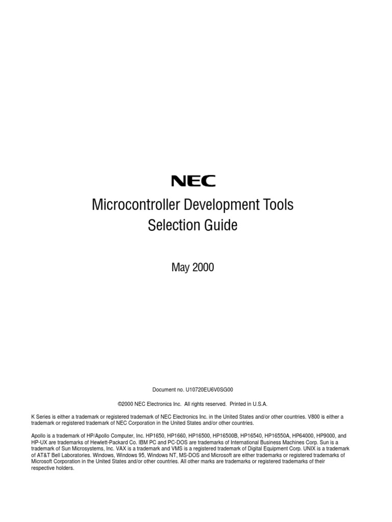 Document no. U10720EU6V0SG00 2000 NEC Electronics Inc. All rights reserved. Printed in U.S.A. K Series is either a trademark or registered trademark of NEC Electronics Inc. in the United States and/or other countries. V800 is either a trademark or registered trademark of NEC Corporation in the United States and/or other countries. Apollo is a trademark of HP/Apollo Computer, Inc. HP1650, HP1660, HP16500, HP16500B, HP16540, HP16550A, HP64000, HP9000, and HP-UX are trademarks of Hewlett-Packard Co. IBM PC and PC-DOS are trademarks of International Business Machines Corp. Sun is a trademark of Sun Microsystems, Inc. VAX is a trademark and VMS is a registered trademark of Digital Equipment Corp. UNIX is a trademark of AT&T Bell Laboratories. Windows, Windows 95, Windows NT, MS-DOS and Microsoft are either trademarks or registered trademarks of Microsoft Corporation in the United States and/or other countries. All other marks are trademarks or registered trademarks of their respective holders.