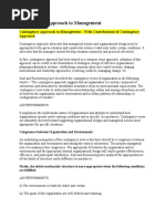 Basic idea of Contingency Approach: It relies on the fact that there is no one best way in management process(Planning, organizing, leading & controlling) to solve any tailored circumstances, because organizations, people, & situations vary and change over time. Thus the right thing to do depends on a complexity of critical environment and internal contingencies. i.e. The basic idea is that there cannot be a particular management action which will be suitable for all situation. Rather, an appropriate action is one which is designed on the basis of external environment and internal states needs. Contingency vs. Situational Approach Some researchers of that period distinguished between contingency and situational approaches by suggesting that SA: implies that what a manager will do depends on a given situation CA: on the other hand had an active inter-relationship between variables in a situation and the managerial actions devised. Thus it takes into account not only the given situation but also the influence of given solution on behavioral patterns of organization. Despite all these differences and emphasis on varying factors, themes of both the approaches are the same. Relationship between Systems Approach & Contingency Approach Contingency theorists have accepted the basic tenets of the systems approach. They accepted the basic features of organization-environment relationship and dynamic nature of organization. However they feel that systems approach is too abstract to apply for managerial actions. This can be overcome by modifying systems framework and translating it into operational framework. Model of Human Being Systems Approach usually employs a richer model of human beings than Contingency Approach, i.e it takes into account the full range of human behaviour in the organisation Contingency Approach, by large, is only interested in the structural adaptation of the organisation to its task environment Structural change in an organisation is taken into account in response to the change in the environment. Organizational Variables Systems Approach is very broad and tries to cover personal, social, technical, structural and environmental variables. Managing involves establishing relationship among these variables & considering them in action Contingency Approach, concentrates on the structural adaptation of organisation and it tends to predict the ultimate outcome of a disturbance of the organisational equilibrium by a change in the environment