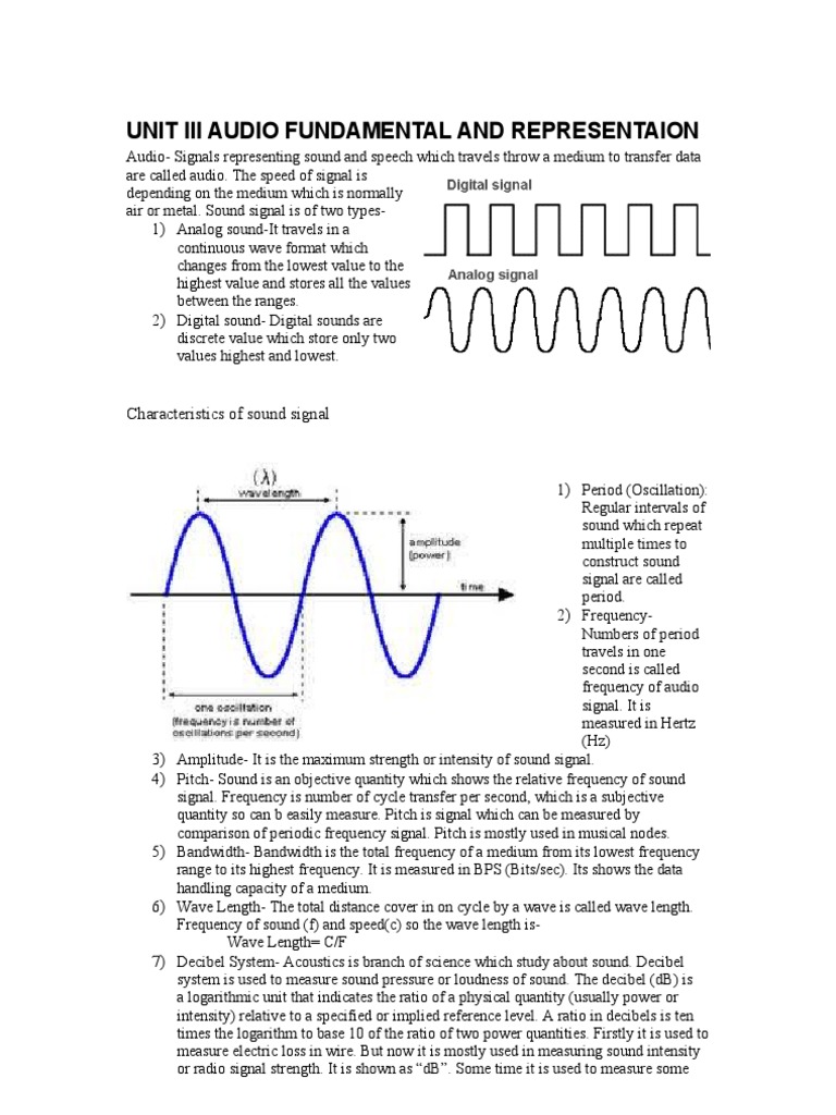 Regular intervals of sound which repeat multiple times to construct sound signal are called period. 2) FrequencyNumbers of period travels in one second is called frequency of audio signal. It is measured in Hertz (Hz) Amplitude- It is the maximum strength or intensity of sound signal. Pitch- Sound is an objective quantity which shows the relative frequency of sound signal. Frequency is number of cycle transfer per second, which is a subjective quantity so can b easily measure. Pitch is signal which can be measured by comparison of periodic frequency signal. Pitch is mostly used in musical nodes. Bandwidth- Bandwidth is the total frequency of a medium from its lowest frequency range to its highest frequency. It is measured in BPS (Bits/sec). Its shows the data handling capacity of a medium. Wave Length- The total distance cover in on cycle by a wave is called wave length. Frequency of sound (f) and speed(c) so the wave length isWave Length= C/F Decibel System- Acoustics is branch of science which study about sound. Decibel system is used to measure sound pressure or loudness of sound. The decibel (dB) is a logarithmic unit that indicates the ratio of a physical quantity (usually power or intensity) relative to a specified or implied reference level. A ratio in decibels is ten times the logarithm to base 10 of the ratio of two power quantities. Firstly it is used to measure electric loss in wire. But now it is mostly used in measuring sound intensity or radio signal strength. It is shown as dB. Some time it is used to measure some