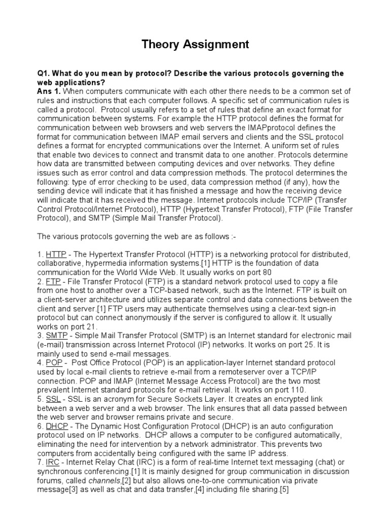 Q1. What do you mean by protocol? Describe the various protocols governing the web applications? Ans 1. When computers communicate with each other there needs to be a common set of rules and instructions that each computer follows. A specific set of communication rules is called a protocol. Protocol usually refers to a set of rules that define an exact format for communication between systems. For example the HTTP protocol defines the format for communication between web browsers and web servers the IMAPprotocol defines the format for communication between IMAP email servers and clients and the SSL protocol defines a format for encrypted communications over the Internet. A uniform set of rules that enable two devices to connect and transmit data to one another. Protocols determine how data are transmitted between computing devices and over networks. They define issues such as error control and data compression methods. The protocol determines the following: type of error checking to be used, data compression method (if any), how the sending device will indicate that it has finished a message and how the receiving device will indicate that it has received the message. Internet protocols include TCP/IP (Transfer Control Protocol/Internet Protocol), HTTP (Hypertext Transfer Protocol), FTP (File Transfer Protocol), and SMTP (Simple Mail Transfer Protocol). The various protocols governing the web are as follows :1. HTTP - The Hypertext Transfer Protocol (HTTP) is a networking protocol for distributed, collaborative, hypermedia information systems.[1] HTTP is the foundation of data communication for the World Wide Web. It usually works on port 80 2. FTP - File Transfer Protocol (FTP) is a standard network protocol used to copy a file from one host to another over a TCP-based network, such as the Internet. FTP is built on a client-server architecture and utilizes separate control and data connections between the client and server.[1] FTP users may authenticate themselves using a clear-text sign-in protocol but can connect anonymously if the server is configured to allow it. It usually works on port 21. 3. SMTP - Simple Mail Transfer Protocol (SMTP) is an Internet standard for electronic mail (e-mail) transmission across Internet Protocol (IP) networks. It works on port 25. It is mainly used to send e-mail messages. 4. POP - Post Office Protocol (POP) is an application-layer Internet standard protocol used by local e-mail clients to retrieve e-mail from a remoteserver over a TCP/IP connection. POP and IMAP (Internet Message Access Protocol) are the two most prevalent Internet standard protocols for e-mail retrieval. It works on port 110. 5. SSL - SSL is an acronym for Secure Sockets Layer. It creates an encrypted link between a web server and a web browser. The link ensures that all data passed between the web server and browser remains private and secure. 6. DHCP - The Dynamic Host Configuration Protocol (DHCP) is an auto configuration protocol used on IP networks. DHCP allows a computer to be configured automatically, eliminating the need for intervention by a network administrator. This prevents two computers from accidentally being configured with the same IP address. 7. IRC - Internet Relay Chat (IRC) is a form of real-time Internet text messaging (chat) or synchronous conferencing.[1] It is mainly designed for group communication in discussion forums, called channels,[2] but also allows one-to-one communication via private message[3] as well as chat and data transfer,[4] including file sharing.[5]
