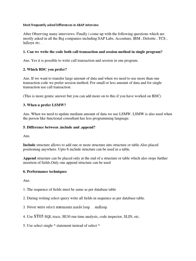After Observing many interviews. Finally i come up with the following questions which are mostly asked in all the Big companies including SAP Labs, Accenture, IBM , Deloitte , TCS , Infosys etc 1. Can we write the code both call transaction and session method in single program? Ans. Yes it is possible to write call transaction and session in one program. 2. Which BDC you prefer? Ans. If we want to transfer large amount of data and when we need to use more than one transaction code we prefer session method. For small or less amount of data and for single transaction use call transaction. (This is more genric answer but you can add more on to this if you have worked on BDC) 3. When u prefer LSMW? Ans. When we need to update medium amount of data we use LSMW. LSMW is also used when the person like functional consultant has less programming language. 5. Difference between .include and .append? Ans. Include structure allows to add one or more structure into structure or table.Also placed positioning anywhere. Upto 6 include structure can be used in a table. Append structure can be placed only at the end of a structure or table which also stops further insertion of fields.Only one append structure can be used 6. Performance techniques Ans. 1. The sequence of fields must be same as per database table 2. During writing select query write all fields in sequence as per database table. 3. Never write select statements inside loop.endloop. 4. Use ST05 SQL trace, SE30 run time analysis, code inspector, SLIN, etc. 5. Use select single * statement instead of select *