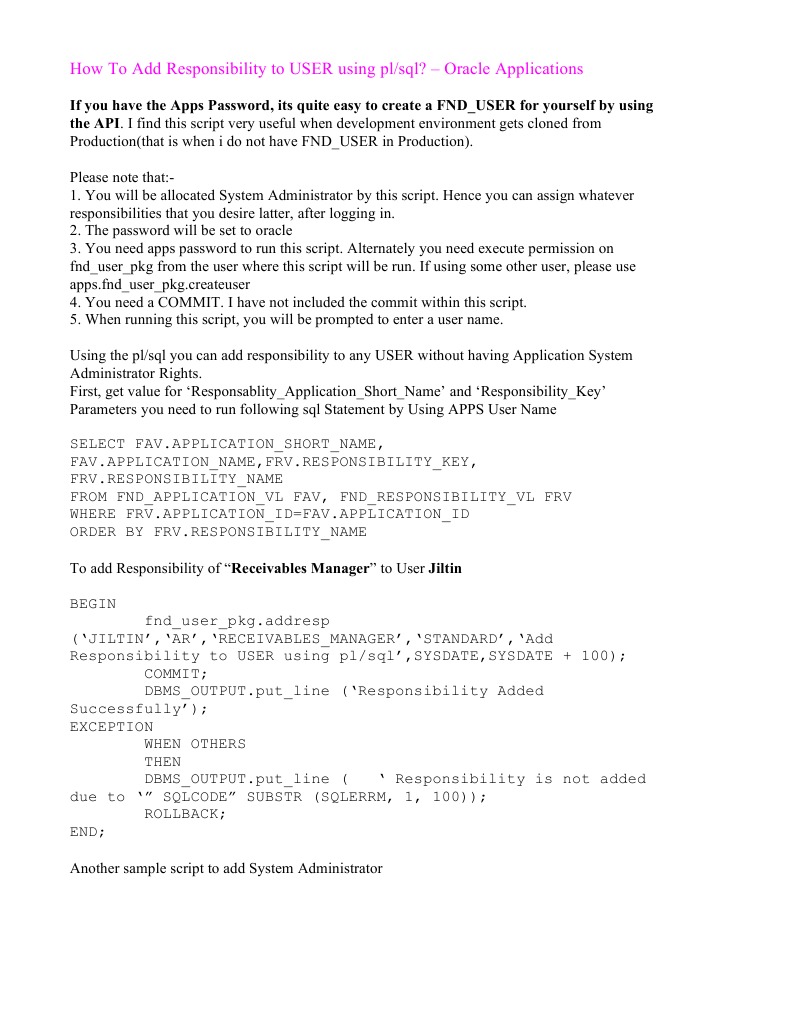 &Security_Group, /* Most of cases it is STANDARD so you can hard code it */ &Description, /* Any comments you want */ &Start_Date, /* Sysdate From Today */ &End_Date ); /* Sysdate + 365 Rights for Next One Year*/ commit; dbms_output.put_line(Responsibility Added Successfully); exception when others then dbms_output.put_line( Responsibility is not added due to SQLCODE substr(SQLERRM, 1, 100)); Rollback; end; /