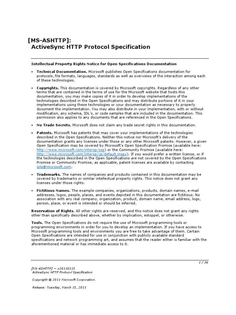 3 / 36 [MS-ASHTTP] v20110315 ActiveSync HTTP Protocol Specification Copyright 2011 Microsoft Corporation. Release: Tuesday, March 15, 2011