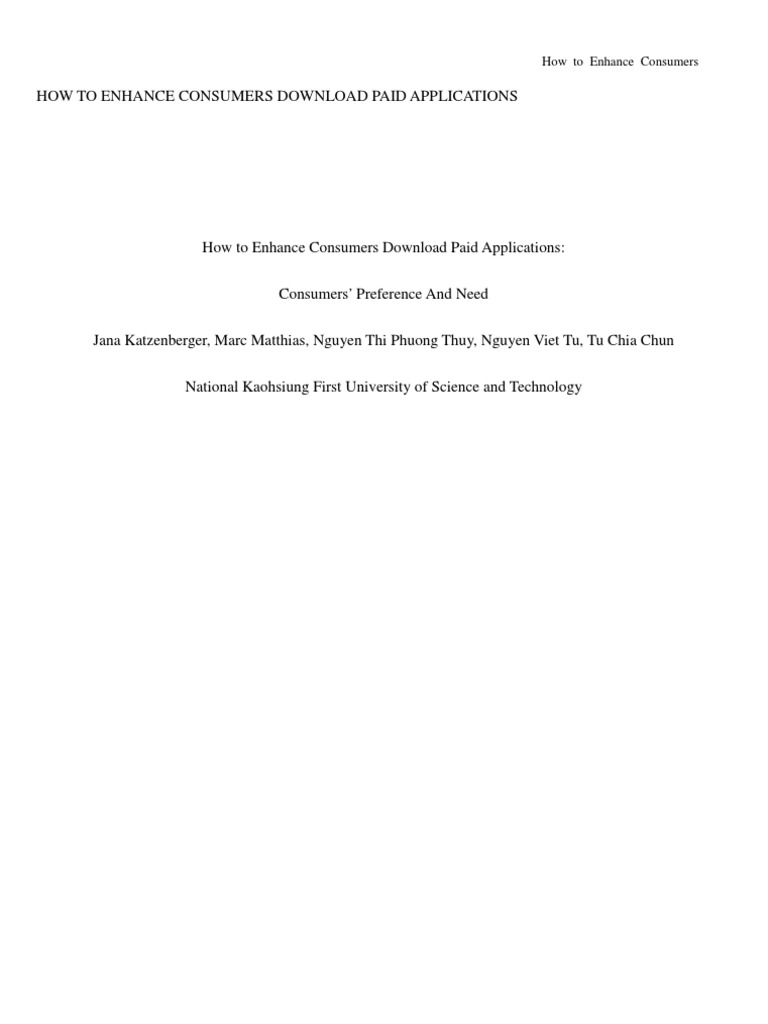 How to Enhance Consumers Download Paid Applications: Consumers Preference And Need Jana Katzenberger, Marc Matthias, Nguyen Thi Phuong Thuy, Nguyen Viet Tu, Tu Chia Chun National Kaohsiung First University of Science and Technology