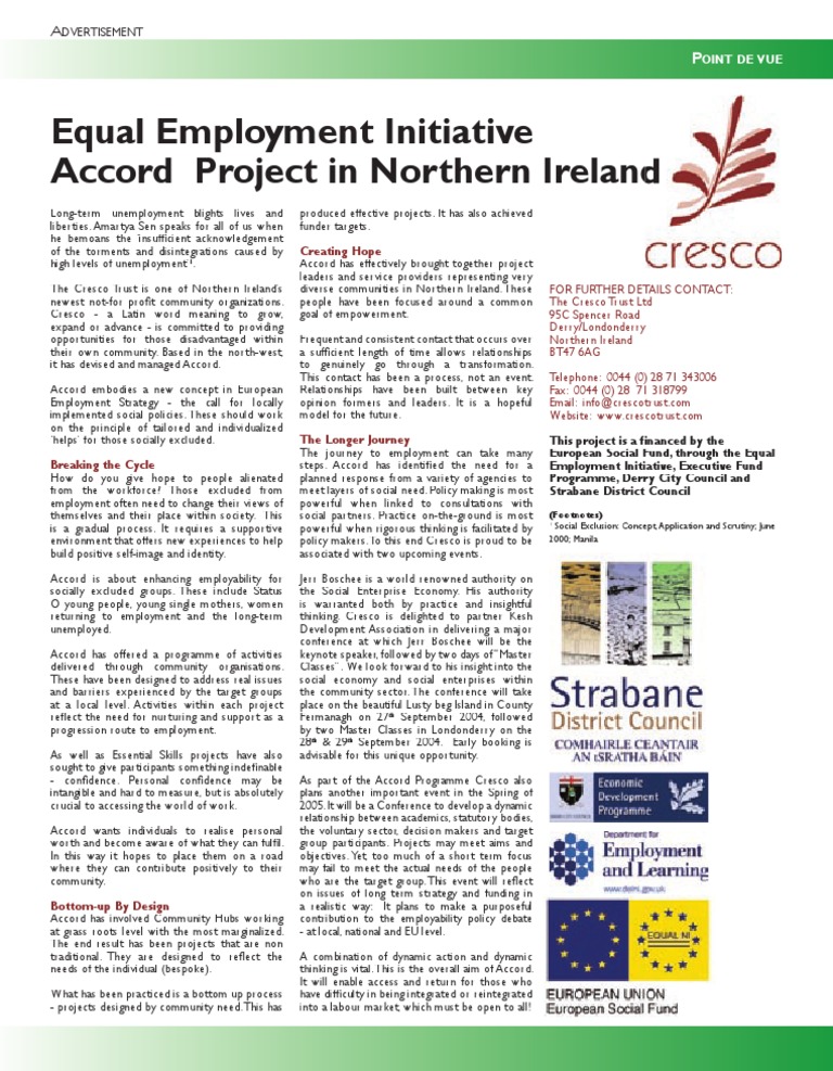 Long-term unemployment blights lives and liberties. Amartya Sen speaks for all of us when he bemoans the insufficient acknowledgement of the torments and disintegrations caused by high levels of unemployment1. The Cresco Trust is one of Northern Irelands newest not-for profit community organizations. Cresco - a Latin word meaning to grow, expand or advance - is committed to providing opportunities for those disadvantaged within their own community. Based in the north-west, it has devised and managed Accord. Accord embodies a new concept in European Employment Strategy - the call for locally implemented social policies. These should work on the principle of tailored and individualized helps for those socially excluded. Breaking the Cycle How do you give hope to people alienated from the workforce? Those excluded from employment often need to change their views of themselves and their place within society. This is a gradual process. It requires a supportive environment that offers new experiences to help build positive self-image and identity. Accord is about enhancing employability for socially excluded groups. These include Status O young people, young single mothers, women returning to employment and the long-term unemployed. Accord has offered a programme of activities delivered through community organisations. These have been designed to address real issues and barriers experienced by the target groups at a local level. Activities within each project reflect the need for nurturing and support as a progression route to employment. As well as Essential Skills projects have also sought to give participants something indefinable - confidence. Personal confidence may be intangible and hard to measure, but is absolutely crucial to accessing the world of work. Accord wants individuals to realise personal worth and become aware of what they can fulfil. In this way it hopes to place them on a road where they can contribute positively to their community. Bottom-up By Design Accord has involved Community Hubs working at grass roots level with the most marginalized. The end result has been projects that are non traditional. They are designed to reflect the needs of the individual (bespoke). What has been practiced is a bottom up process - projects designed by community need. This has produced effective projects. It has also achieved funder targets. Creating Hope Accord has effectively brought together project leaders and service providers representing very diverse communities in Northern Ireland. These people have been focused around a common goal of empowerment. Frequent and consistent contact that occurs over a sufficient length of time allows relationships to genuinely go through a transformation. This contact has been a process, not an event. Relationships have been built between key opinion formers and leaders. It is a hopeful model for the future. The Longer Journey The journey to employment can take many steps. Accord has identified the need for a planned response from a variety of agencies to meet layers of social need. Policy making is most powerful when linked to consultations with social partners. Practice on-the-ground is most powerful when rigorous thinking is facilitated by policy makers. To this end Cresco is proud to be associated with two upcoming events. Jerr Boschee is a world renowned authority on the Social Enterprise Economy. His authority is warranted both by practice and insightful thinking. Cresco is delighted to partner Kesh Development Association in delivering a major conference at which Jerr Boschee will be the keynote speaker, followed by two days of Master Classes. We look forward to his insight into the social economy and social enterprises within the community sector. The conference will take place on the beautiful Lusty beg Island in County Fermanagh on 27th September 2004, followed by two Master Classes in Londonderry on the 28th & 29th September 2004. Early booking is advisable for this unique opportunity. As part of the Accord Programme Cresco also plans another important event in the Spring of 2005. It will be a Conference to develop a dynamic relationship between academics, statutory bodies, the voluntary sector, decision makers and target group participants. Projects may meet aims and objectives. Yet, too much of a short term focus may fail to meet the actual needs of the people who are the target group. This event will reflect on issues of long term strategy and funding in a realistic way: It plans to make a purposeful contribution to the employability policy debate - at local, national and EU level. A combination of dynamic action and dynamic thinking is vital. This is the overall aim of Accord. It will enable access and return for those who have difficulty in being integrated or reintegrated into a labour market, which must be open to all! FOR FURTHER DETAILS CONTACT: The Cresco Trust Ltd 95C Spencer Road Derry/Londonderry Northern Ireland BT47 6AG Telephone: 0044 (0) 28 71 343006 Fax: 0044 (0) 28 71 318799 Email: info@crescotrust.com Website: www.crescotrust.com This project is a financed by the European Social Fund, through the Equal Employment Initiative, Executive Fund Programme, Derry City Council and Strabane District Council