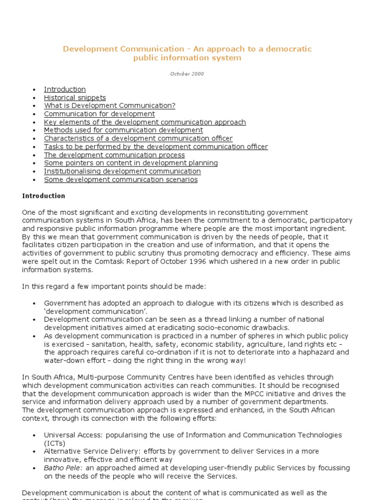 Introduction Historical snippets What is Development Communication? Communication for development Key elements of the development communication approach Methods used for communication development Characteristics of a development communication officer Tasks to be performed by the development communication officer The development communication process Some pointers on content in development planning Institutionalising development communication Some development communication scenarios
