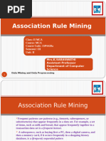 International Journal of Computer Applications (0975 8887) Volume 21 No.5, May 2011 required extensive hands-on analysis can now be answered directly from the data quickly. The primary task of association mining is to detect frequently co-occurring groups of items in transactional databases. The intention is to use this knowledge for prediction purposes. Early attempts for prediction used classification [8] and performance was favourable. In this project, any item is allowed to be treated as a class label its value is to be predicted based on the presence of other items. Put another way, knowing a subset of the shopping carts contents, we want to guess (predict) [1] the rest. Suppose the shopping cart of a customer at the checkout counter contains bread, butter, milk, cheese, and pudding. Could someone who met the same customer when the cart contained only bread, butter, and milk, have predicted that the person would add cheese and pudding? It is important to understand that allowing any item to be treated as a class label presents serious challenges as compared with the case of just a single class label. The number of different items can be very high, perhaps hundreds, or thousand, or even more. To generate association rules for each of them separately would give rise to great many rules with two obvious consequences: first, the memory space occupied by these rules can be many times larger than the original database (because of the tasks combinatorial nature); second, identifying the most relevant rules and combining their sometimes conflicting predictions may easily incur prohibitive computational costs. In this work, both of these problems are solved by developing a technique that answers users queries (for shopping cart completion) in a way that is acceptable not only in terms of accuracy, but also in terms of time and space complexity. This paradigm can be exploited in diverse applications. For example, in the each shopping cart contained a set of hyperlinks pointing to a Web page; in medical applications, the shopping cart may contain a patients symptoms, results of lab tests, and diagnoses; in a financial domain, the cart may contain companies held in the same portfolio. In all these databases, prediction of unknown items can play a very important role. For instance, a patients symptoms are rarely due to a single cause; two or more diseases usually conspire to make the person sick. Having identified one, the physician tends to focus on how to treat this single disorder, ignoring others that can meanwhile deteriorate the patients condition. Such unintentional neglect can be prevented by subjecting the patient to all possible lab tests. However, the number of tests one can undergo is limited by such practical factors as time, costs, and the patients discomfort. A decisionsupport system advising a medical doctor about which other diseases may accompany the ones already diagnosed can help in the selection of the most relevant additional tests. upper-bounded by twice the number of transactions in the original database. Note that some of the itemsets in IT-tree [4] are identical to at least one of the transactions contained in the original database, whereas others were created during the process of tree building where they came into being as common ancestors of transactions from lower levels. They modified the original tree building algorithm by flagging each node that is identical to at least one transaction. These are indicated by black dots. This is called flagged IT-tree [4].