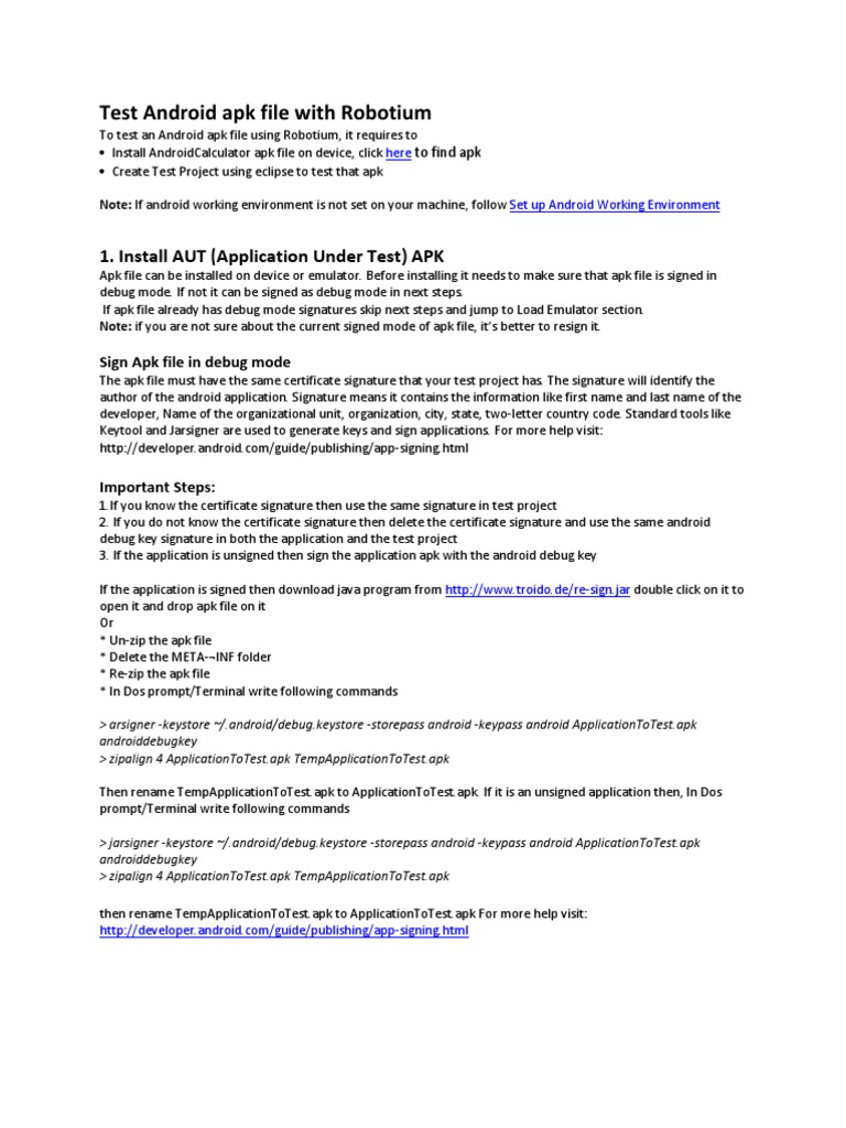 To test an Android apk file using Robotium, it requires to Install AndroidCalculator apk file on device, click here to find apk Create Test Project using eclipse to test that apk Note: If android working environment is not set on your machine, follow Set up Android Working Environment