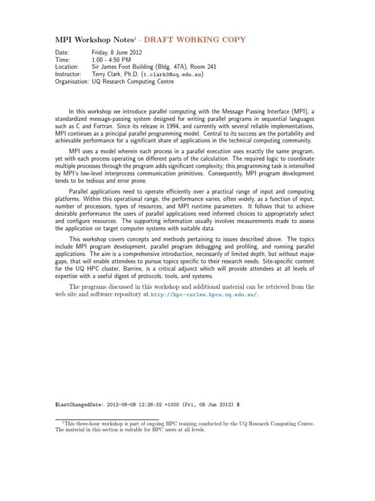 Date: Time: Location: Instructor: Organisation: Friday, 8 June 2012 1:00 - 4:50 PM Sir James Foot Building (Bldg. 47A), Room 241 Terry Clark, Ph.D. (t.clark3@uq.edu.au) UQ Research Computing Centre