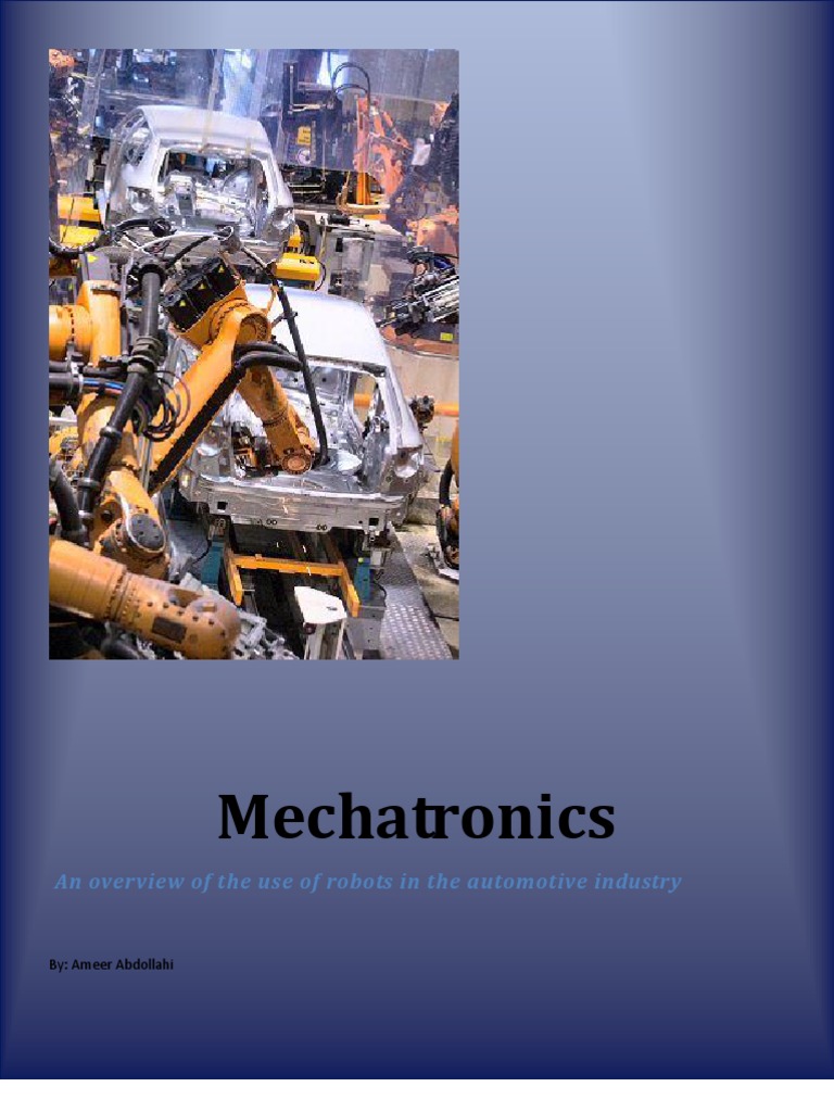Mechatronics .......................................................................................................................................................................... 0 Mechatronics: ......................................................................................................................................................................... 2 An overview of the use of robots in the automotive industry................................................................................................ 2 1 2 3 4 5 6 Introduction ................................................................................................................................................................ 2 The Benefits of Mechatronics ..................................................................................................................................... 3 Mechatronics Tasks ..................................................................................................................................................... 4 Brief Evolution of Mechatronics ................................................................................................................................. 5 Conclusion ................................................................................................................................................................... 9 Bibliography ................................................................................................................................................................ 9