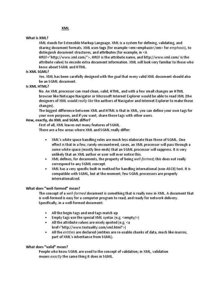 XML is a system for defining, validating, and sharing document formats. XML uses tags (for example <em>emphasis</em> for emphasis), to distinguish document structures, and attributes (for example, in <A HREF="http://www.xml.com/">, HREF is the attribute name, and http://www.xml.com/ is the attribute value) to encode extra document information. XML will look very familiar to those who know about SGML and HTML. Is XML SGML? Yes. XML has been carefully designed with the goal that every valid XML document should also be an SGML document. Is XML HTML? No. An XML processor can read clean, valid, HTML, and with a few small changes an HTML browser like Netscape Navigator or Microsoft Internet Explorer would be able to read XML (the designers of XML would really like the authors of Navigator and Internet Explorer to make those changes). The biggest difference between XML and HTML is that in XML, you can define your own tags for your own purposes, and if you want, share those tags with other users. How, exactly, do XML and SGML differ? First of all, XML leaves out many features of SGML. There are a few areas where XML and SGML really differ: