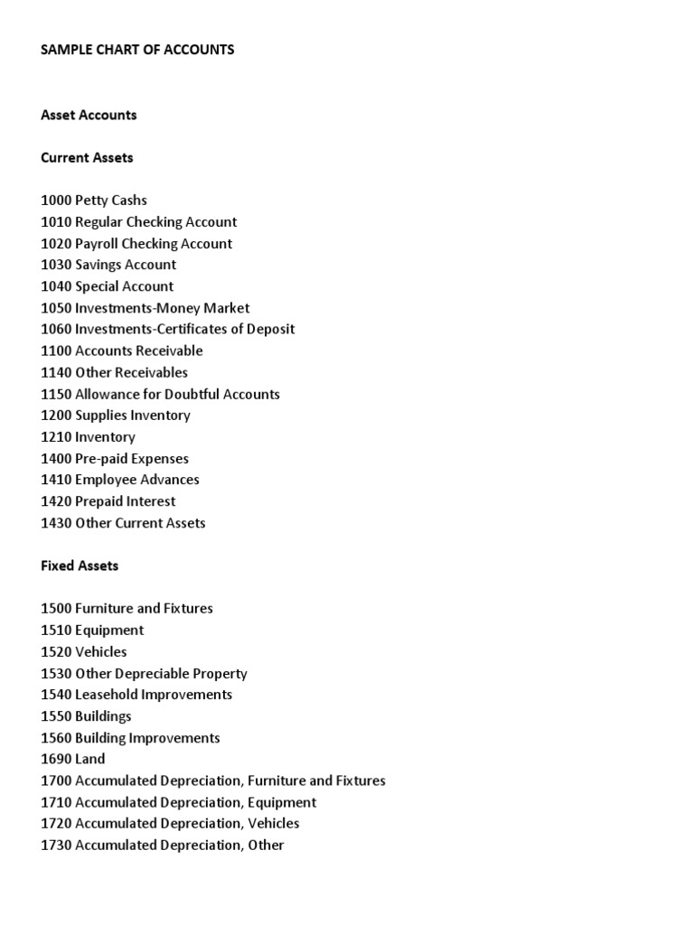 Asset Accounts Current Assets 1000 Petty Cashs 1010 Regular Checking Account 1020 Payroll Checking Account 1030 Savings Account 1040 Special Account 1050 Investments-Money Market 1060 Investments-Certificates of Deposit 1100 Accounts Receivable 1140 Other Receivables 1150 Allowance for Doubtful Accounts 1200 Supplies Inventory 1210 Inventory 1400 Pre-paid Expenses 1410 Employee Advances 1420 Prepaid Interest 1430 Other Current Assets Fixed Assets 1500 Furniture and Fixtures 1510 Equipment 1520 Vehicles 1530 Other Depreciable Property 1540 Leasehold Improvements 1550 Buildings 1560 Building Improvements 1690 Land 1700 Accumulated Depreciation, Furniture and Fixtures 1710 Accumulated Depreciation, Equipment 1720 Accumulated Depreciation, Vehicles 1730 Accumulated Depreciation, Other