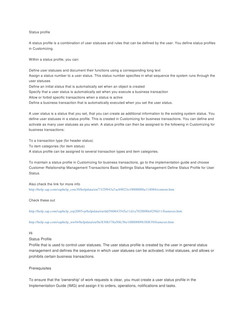 You define status profiles in Customizing. Within a status profile, you can: Define user statuses and document their functions using a corresponding long text Assign a status number to a user status. This status number specifies in what sequence the system runs through the user statuses Define an initial status that is automatically set when an object is created Specify that a user status is automatically set when you execute a business transaction Allow or forbid specific transactions when a status is active Define a business transaction that is automatically executed when you set the user status. A user status is a status that you set, that you can create as additional information to the existing system status. You define user statuses in a status profile. This is created in Customizing for business transactions. You can define and activate as many user statuses as you wish. A status profile can then be assigned to the following in Customizing for business transactions: To a transaction type (for header status) To item categories (for item status) A status profile can be assigned to several transaction types and item categories. To maintain a status profile in Customizing for business transactions, go to the implementation guide and choose Customer Relationship Management Transactions Basic Settings Status Management Define Status Profile for User Status. Also check the link for more info http://help.sap.com/saphelp_crm30/helpdata/en/73/29943a7acb9023e10000000a114084/content.htm Check these out http://help.sap.com/saphelp_erp2005vp/helpdata/en/dd/560643545a11d1a7020000e829fd11/frameset.htm http://help.sap.com/saphelp_nw04/helpdata/en/0e/830b378a50fc5be10000009b38f839/frameset.htm