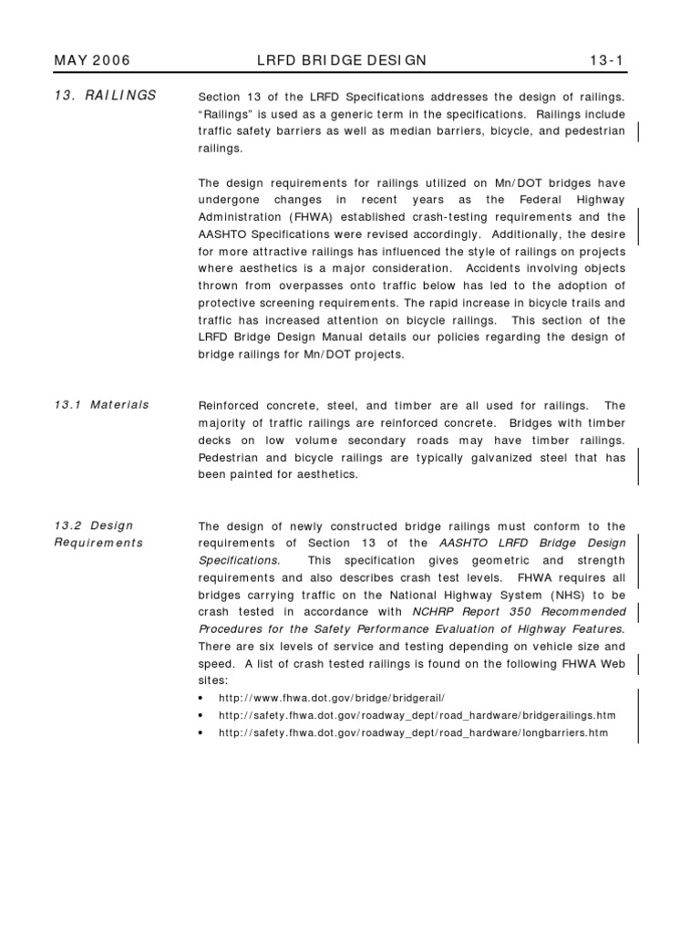 Section 13 of the LRFD Specifications addresses the design of railings. Railings is used as a generic term in the specifications. Railings include traffic safety barriers as well as median barriers, bicycle, and pedestrian railings. The design requirements for railings utilized on Mn/DOT bridges have undergone changes in recent years as the Federal Highway Administration (FHWA) established crash-testing requirements and the AASHTO Specifications were revised accordingly. Additionally, the desire for more attractive railings has influenced the style of railings on projects where aesthetics is a major consideration. Accidents involving objects thrown from overpasses onto traffic below has led to the adoption of protective screening requirements. The rapid increase in bicycle trails and traffic has increased attention on bicycle railings. This section of the LRFD Bridge Design Manual details our policies regarding the design of bridge railings for Mn/DOT projects.