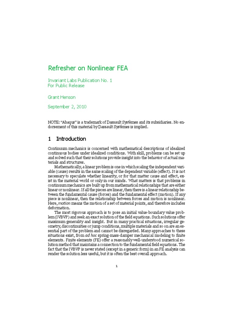 Continuum mechanics is concerned with mathematical descriptions of idealized continuous bodies under idealized conditions. With skill, problems can be set up and solved such that their solutions provide insight into the behavior of actual materials and structures. Mathematically, a linear problem is one in which scaling the independent variable (cause) results in the same scaling of the dependent variable (effect). It is not necessary to speculate whether linearity, or for that matter cause and effect, exist in the material world or only in our minds. What matters is that problems in continuum mechanics are built up from mathematical relationships that are either linear or nonlinear. If all the pieces are linear, then there is a linear relationship between the fundamental cause (forces) and the fundamental effect (motion). If any piece is nonlinear, then the relationship between forces and motion is nonlinear. Here, motion means the motion of a set of material points, and therefore includes deformation. The most rigorous approach is to pose an initial value-boundary value problem (IVBVP) and seek an exact solution of the field equations. Such solutions offer maximum generality and insight. But in many practical situations, irregular geometry, discontinuities or jump conditions, multiple materials and so on are an essential part of the problem and cannot be disregarded. Many approaches to these situations exist, from ad hoc spring-mass-damper mechanical modeling to finite elements. Finite elements (FE) offer a reasonably well-understood numerical solution method that maintains a connection to the fundamental field equations. The fact that the IVBVP is never stated (except in a generic form) in an FE analysis can render the solution less useful, but it is often the best overall approach.